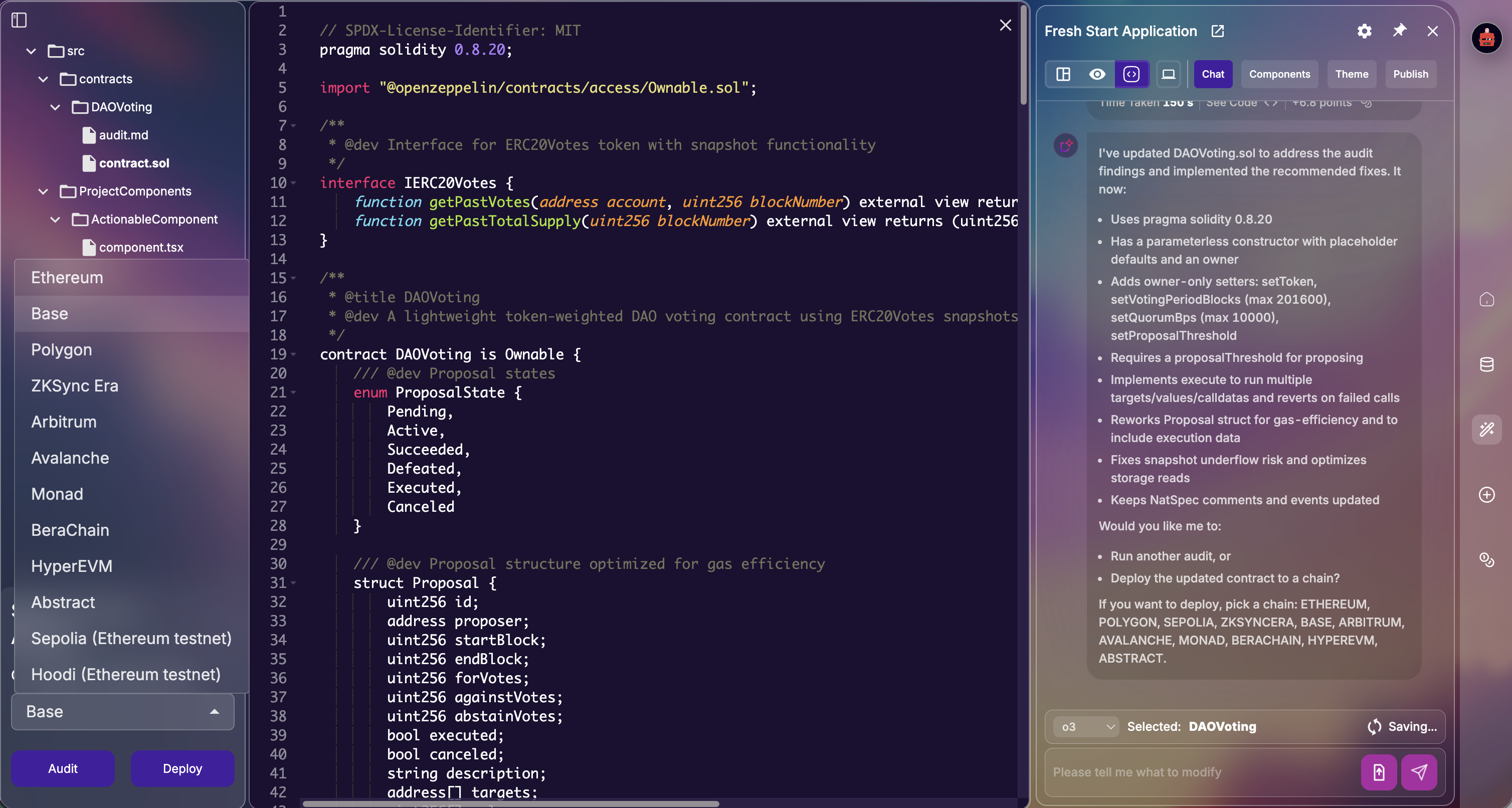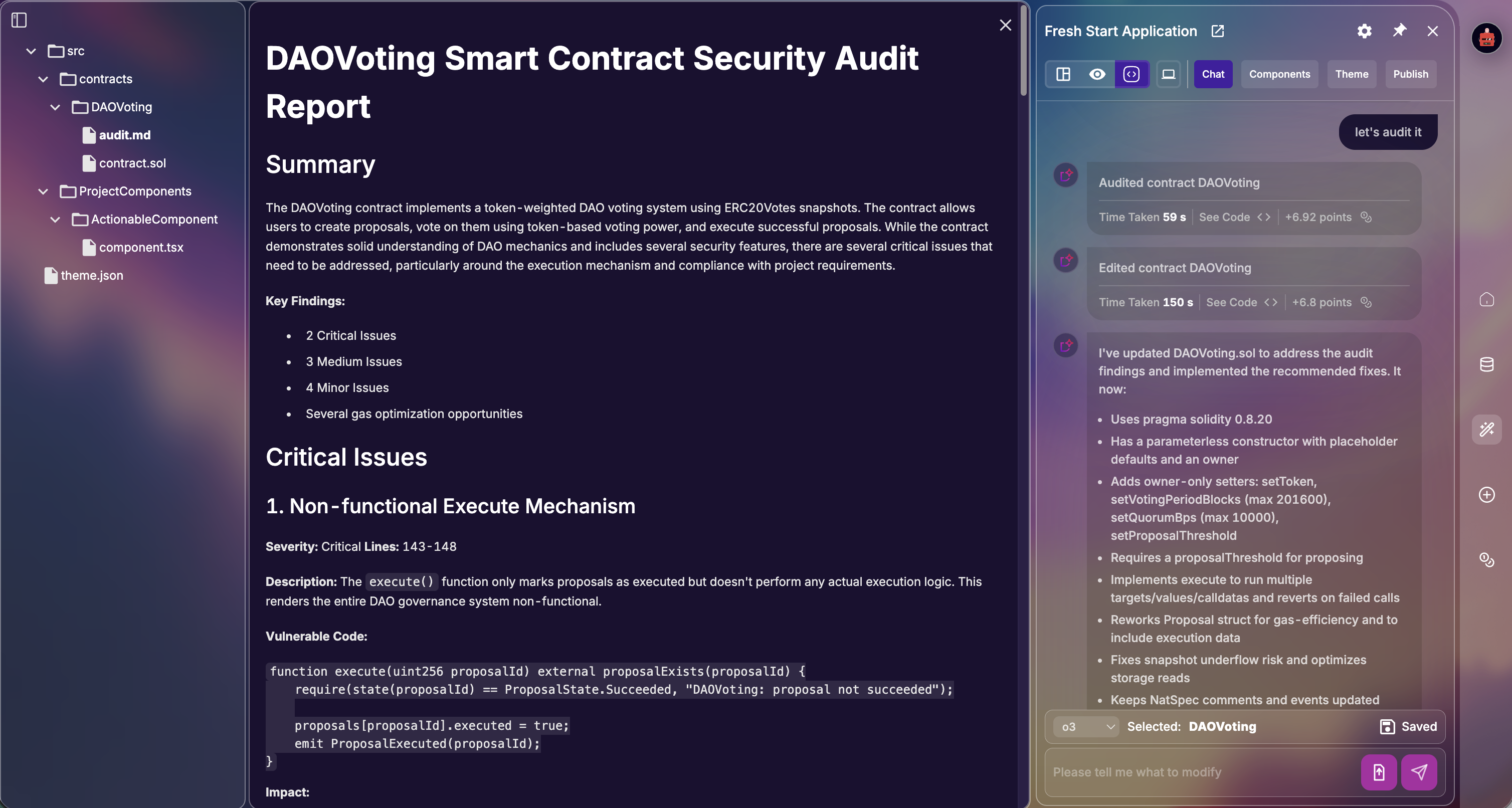 Once the audit has been completed, the chatbot will give you a summary with the key points, or you can see the full result in the "Code Editor" section. You can then ask the chatbot to implement any suggestions from the audit to improve your smart contract.
