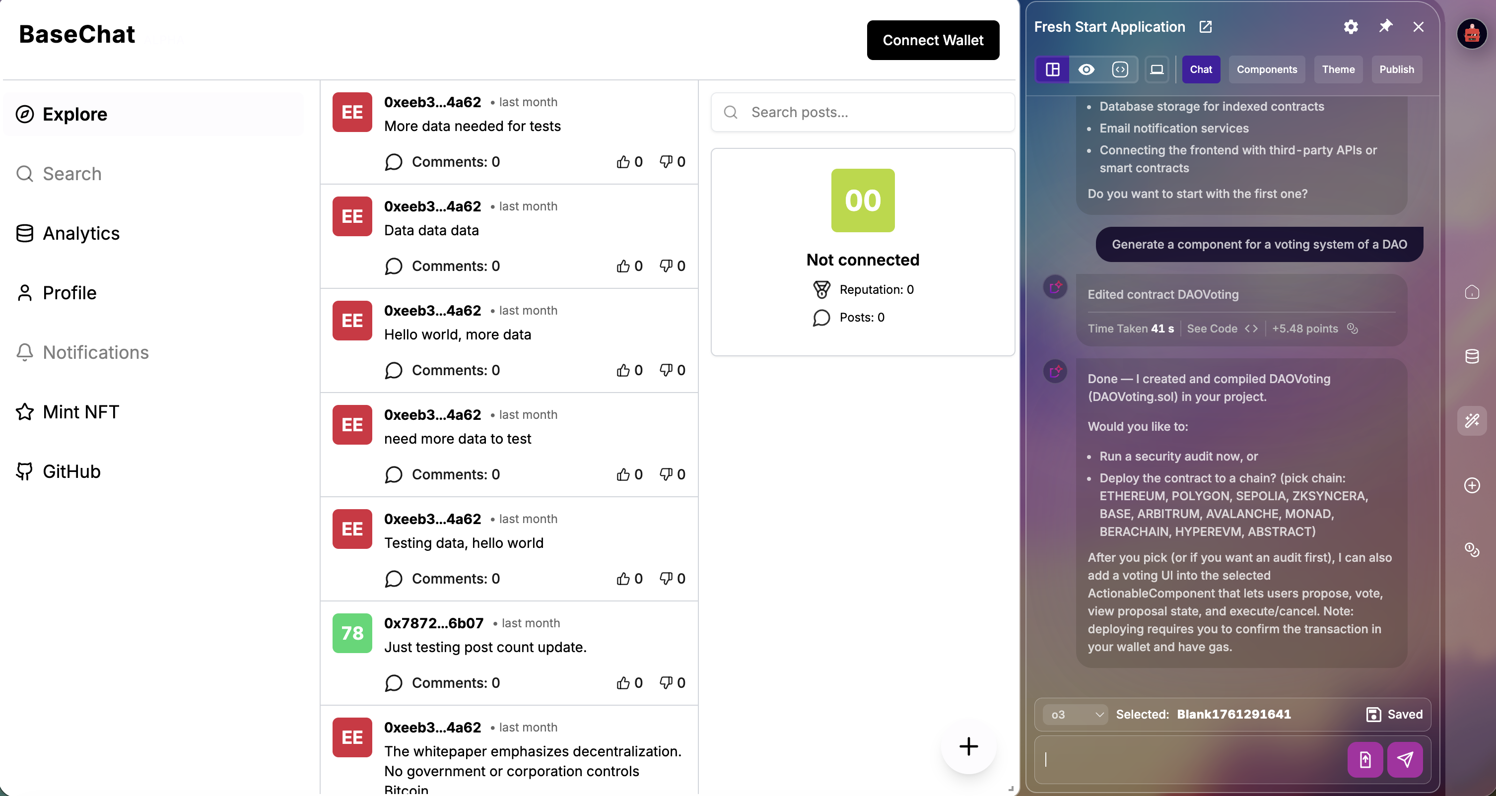 Once a smart contract has been generated, we can choose which chain to deploy it to. We can do this via chatbot, or by selecting the desired chain in the Code Editor section and clicking on "Deploy".