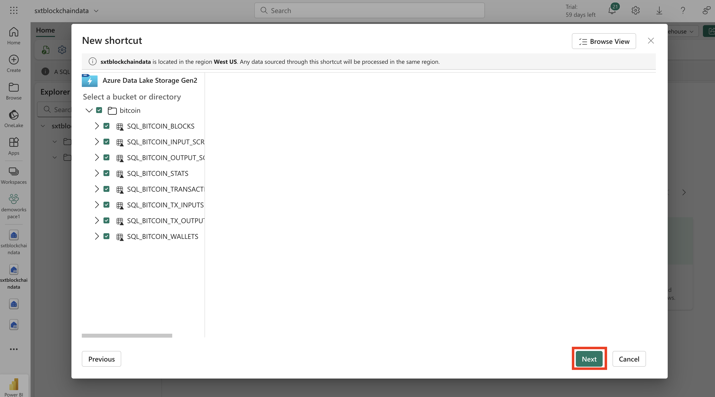 - Select the top level folder for the desire blockchain and all its tables and then click Next.